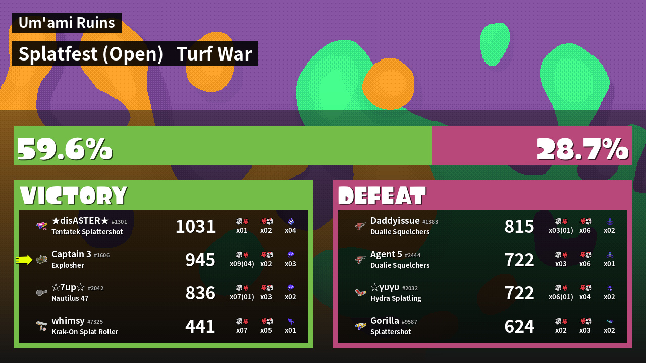 | Medals | #1 Overall Splatter #1 Splat Assister #1 Damage Taker | ||
