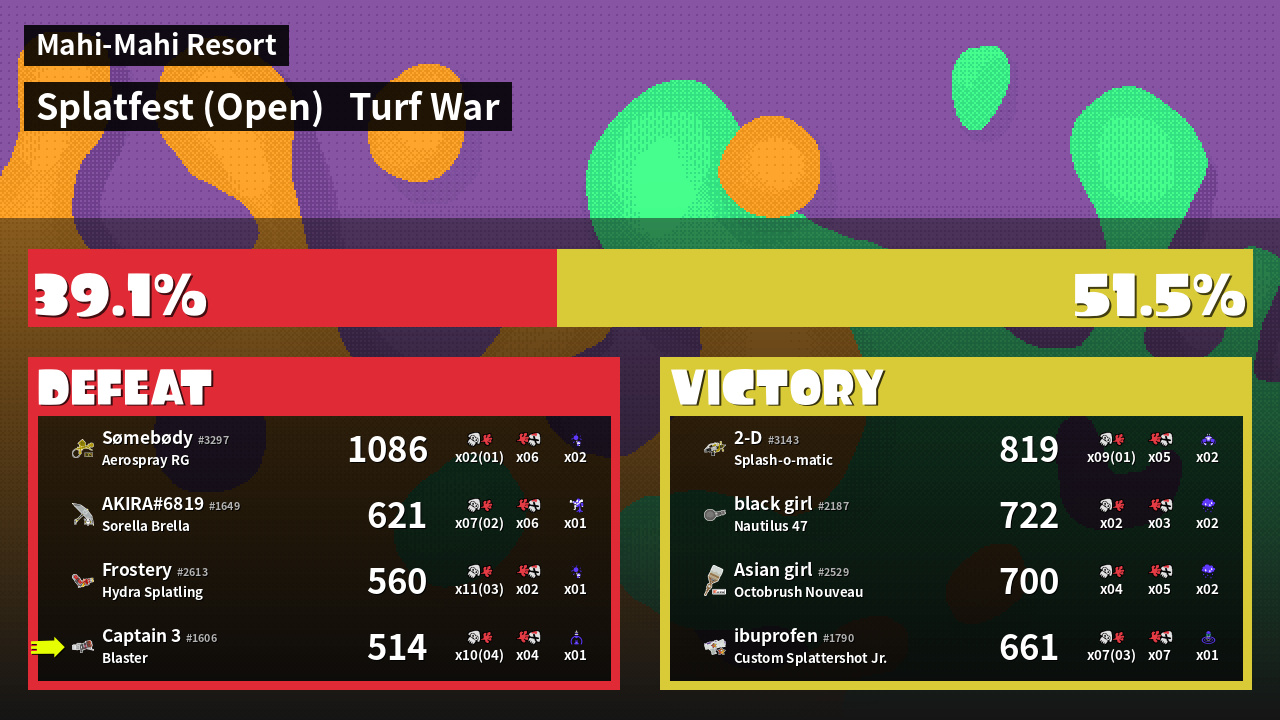 | Medals | #1 Splat Assister #1 Ink Consumer #2 Overall Splatter | ||
