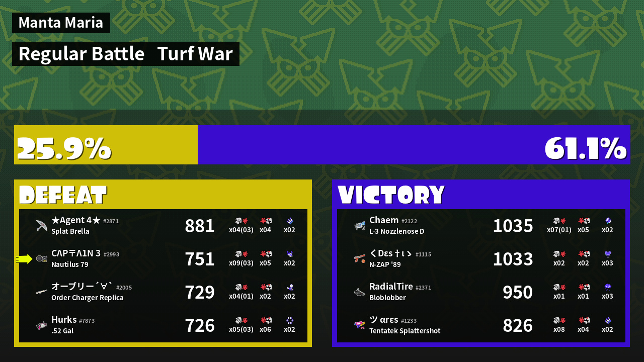 | Medals | #1 Overall Splatter #1 Home-Base Inker #1 Enemy Splatter | ||