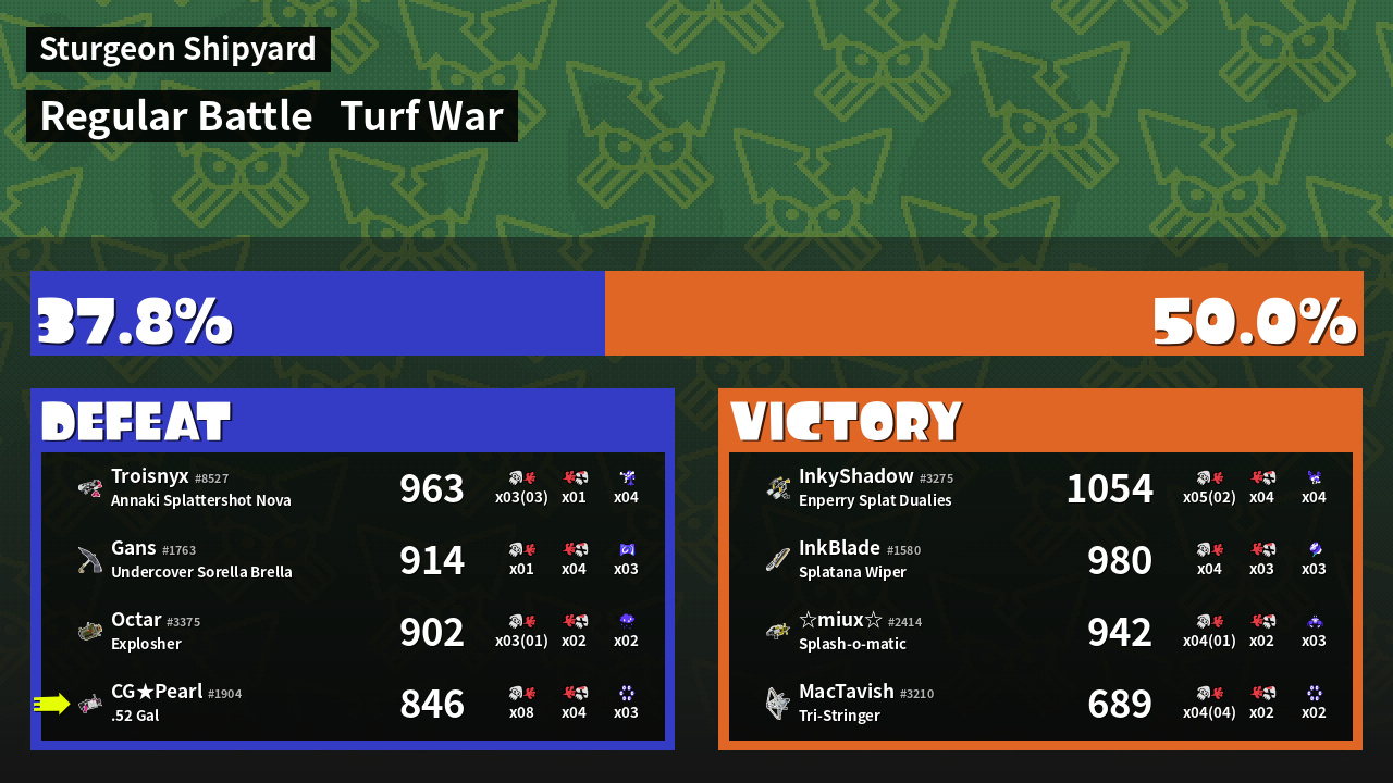 | Medals | #1 Overall Splatter #1 Home-Base Inker #1 Enemy-Base Inker | ||