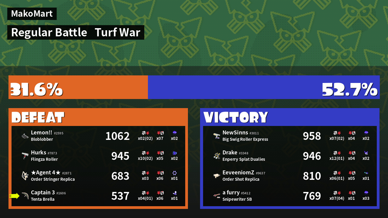 | Medals | #1 Base Defender #1 Damage Taker #2 Overall Splatter | ||