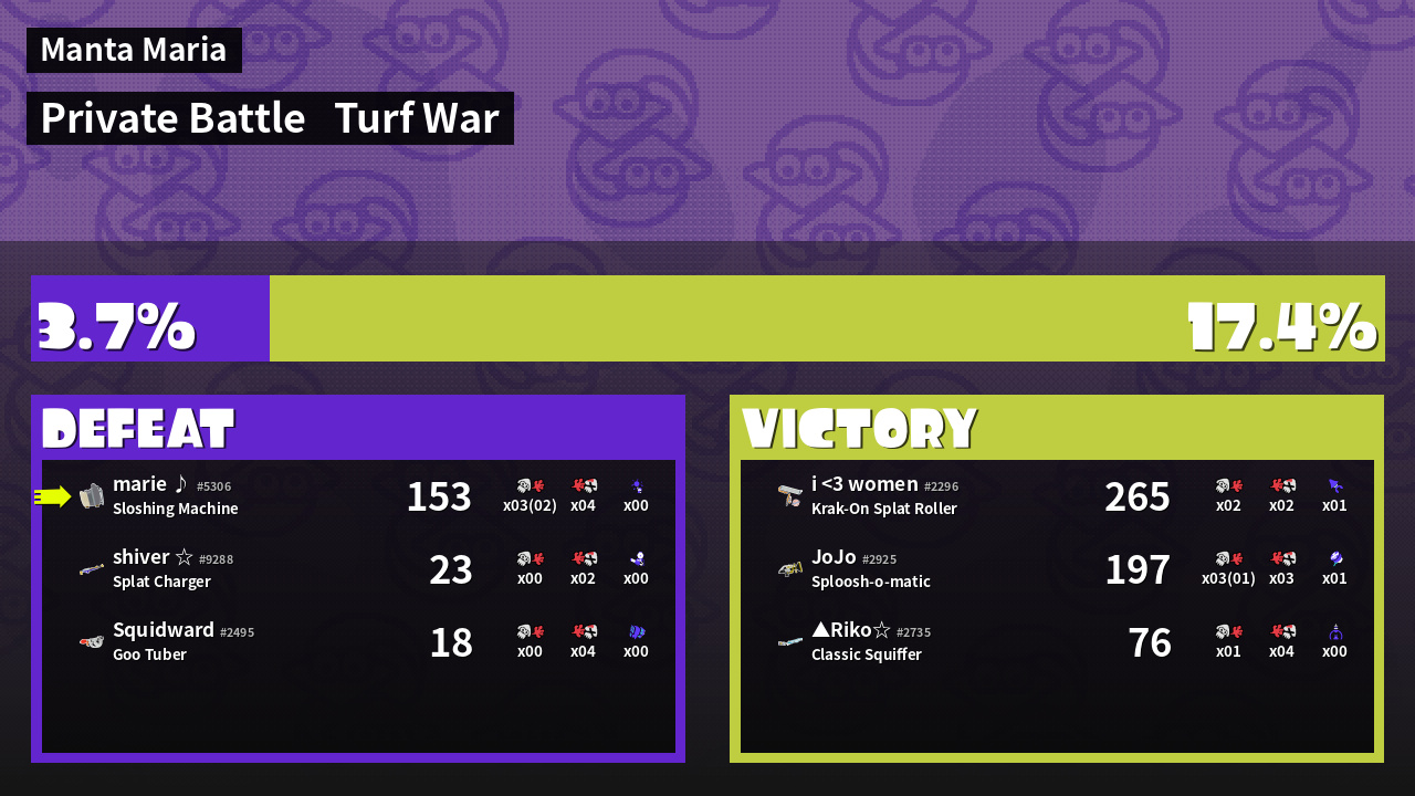 | Mode | Turf War - Private Battle | ||