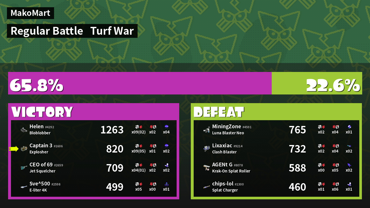 | Medals | #1 Overall Splatter #1 Splat Assister #1 Base Defender | ||