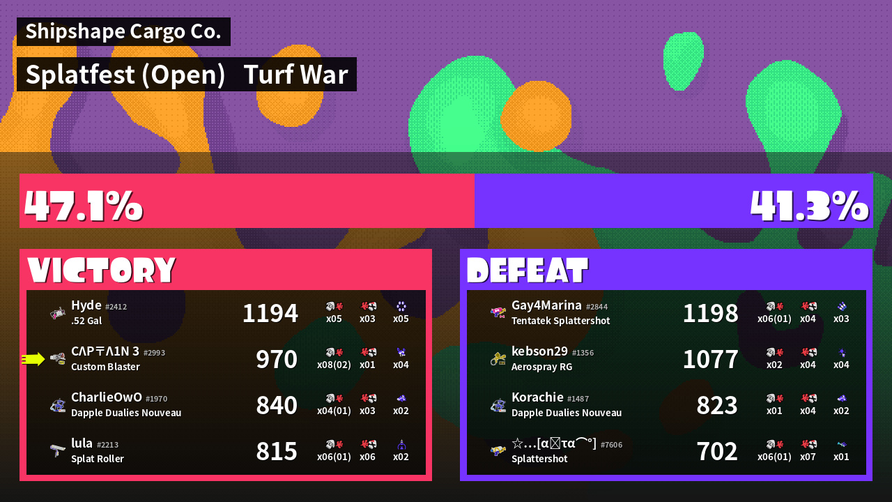| Medals | #1 Overall Splatter #1 Home-Base Inker #1 Enemy Splatter | ||