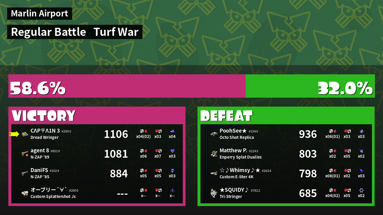 | Medals | #1 Turf Inker #1 Splat Assister #1 Ink Consumer | ||