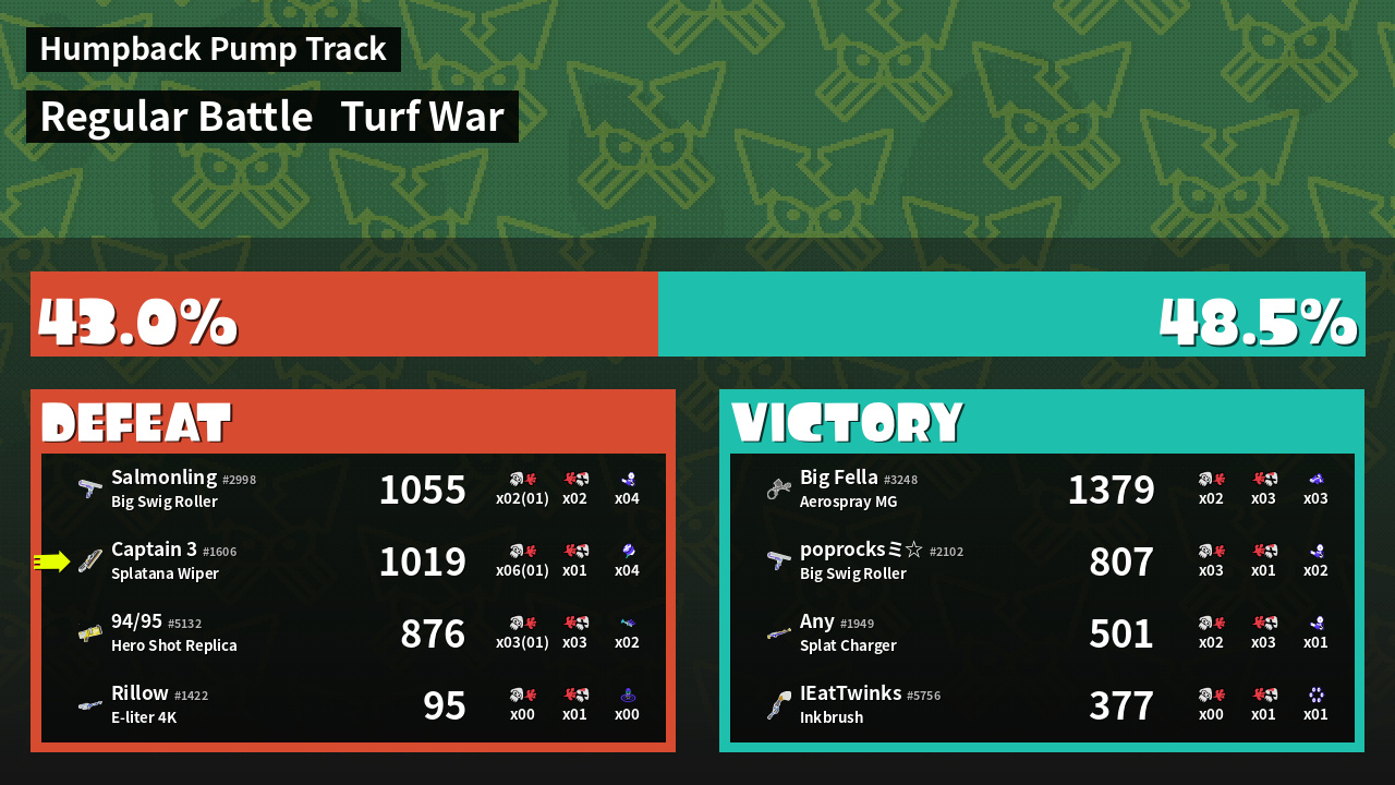 | Medals | #1 Overall Splatter #1 Popular Target #1 Enemy-Base Inker | ||