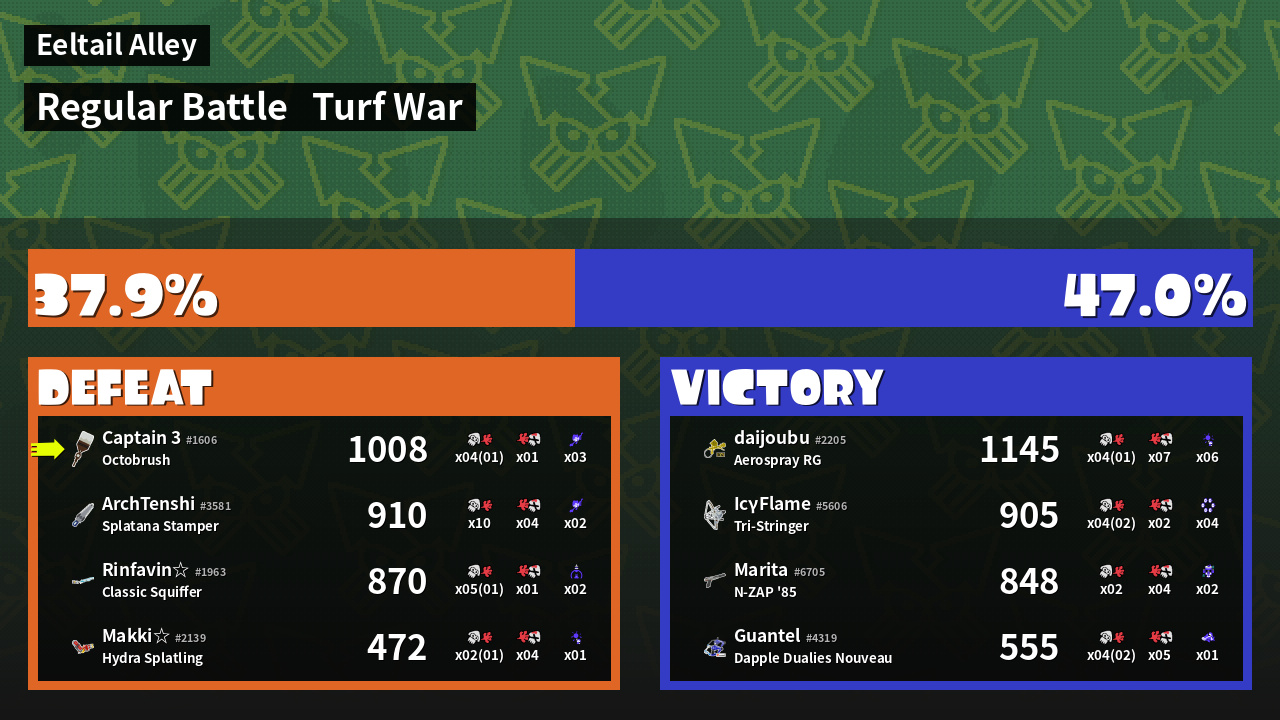 | Medals | #1 Turf Inker #1 Splat Assister #1 Ground Traveler | ||