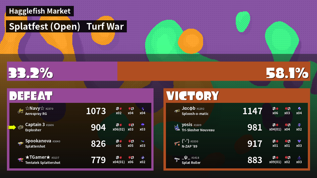 | Medals | #1 Overall Splatter #1 Popular Target #1 Enemy-Base Inker | ||