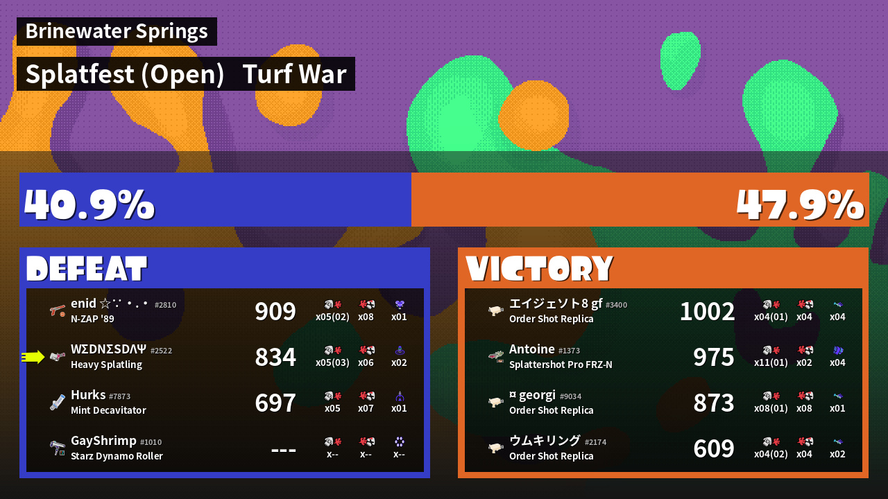 | Medals | #1 Overall Splatter #1 Splat Assister #1 Wave Breaker User | ||