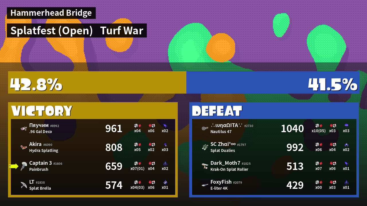 | Medals | #1 Overall Splatter #1 Enemy Splatter #1 Base Defender | ||