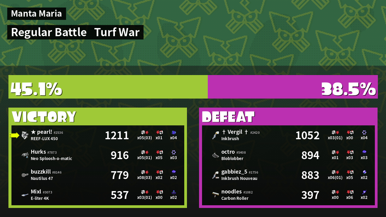 | Medals | #1 Turf Inker #1 Enemy-Base Inker #1 Splat Assister | ||