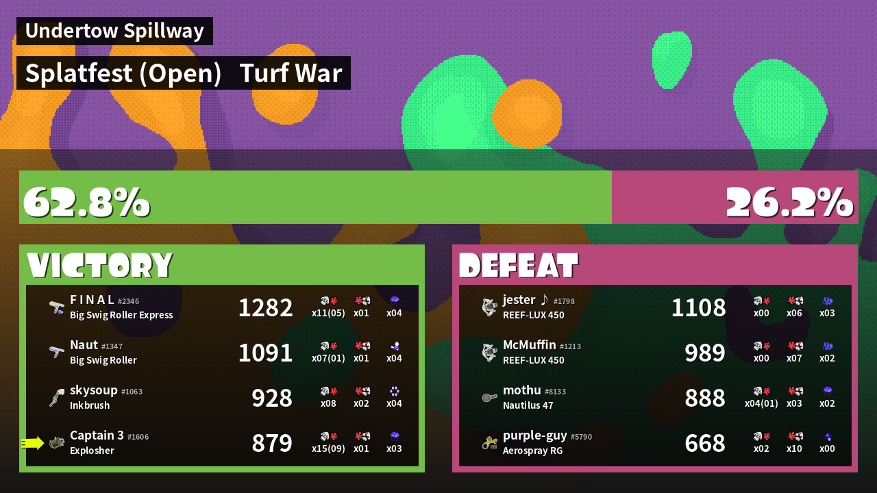 | Medals | #1 Overall Splatter #1 Splat Assister #1 Ink Consumer | ||