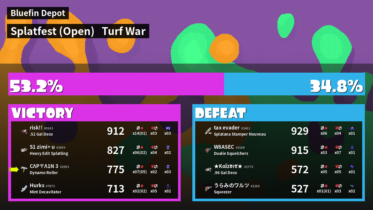 | Medals | #1 Splat Assister #1 Tacticooler User #2 Overall Splatter | ||