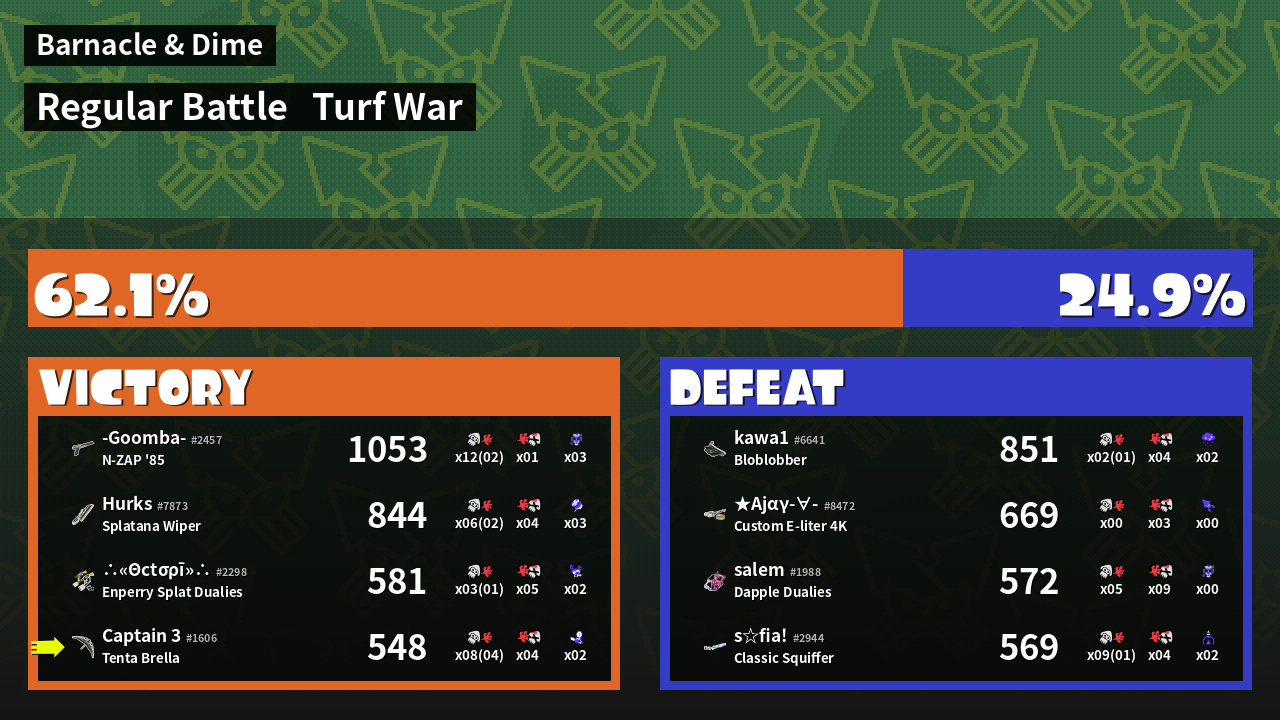 | Medals | #1 Super Jump Spot #1 Splat Assister #2 Overall Splatter | ||