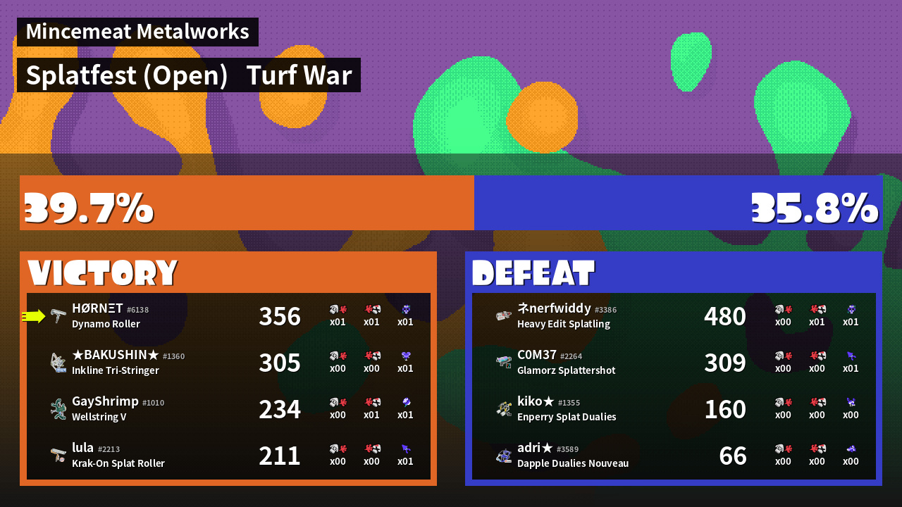 | Medals | #1 Overall Splatter #1 Turf Inker #1 Enemy-Base Inker | ||