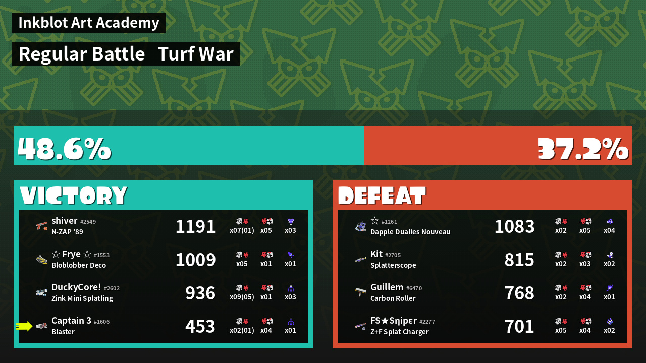 | Medals | #1 Base Defender #2 Enemy-Base Inker #2 Splat Assister | ||