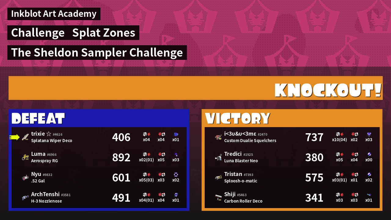 | Medals | #1 Splat Zone Guard #1 Popular Target #1 Enemy Splatter | ||