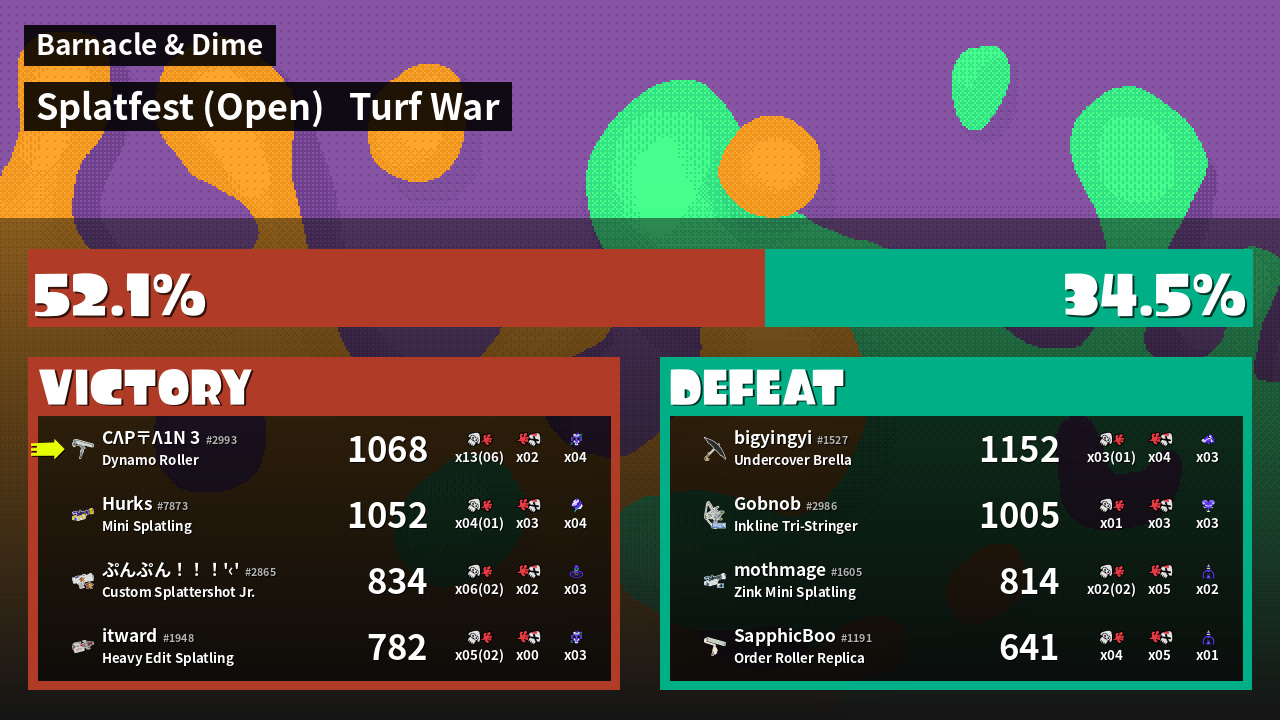 | Medals | #1 Overall Splatter #1 Turf Inker #1 Enemy-Base Inker | ||