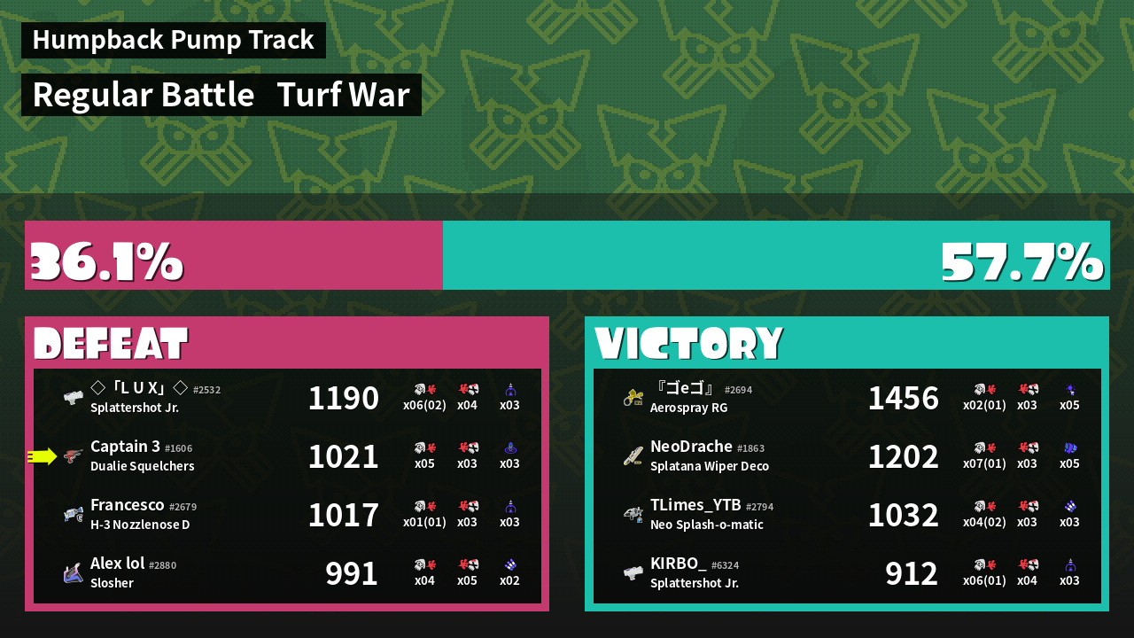 | Medals | #1 Enemy-Base Inker #1 Enemy Splatter #1 Ground Traveler | ||