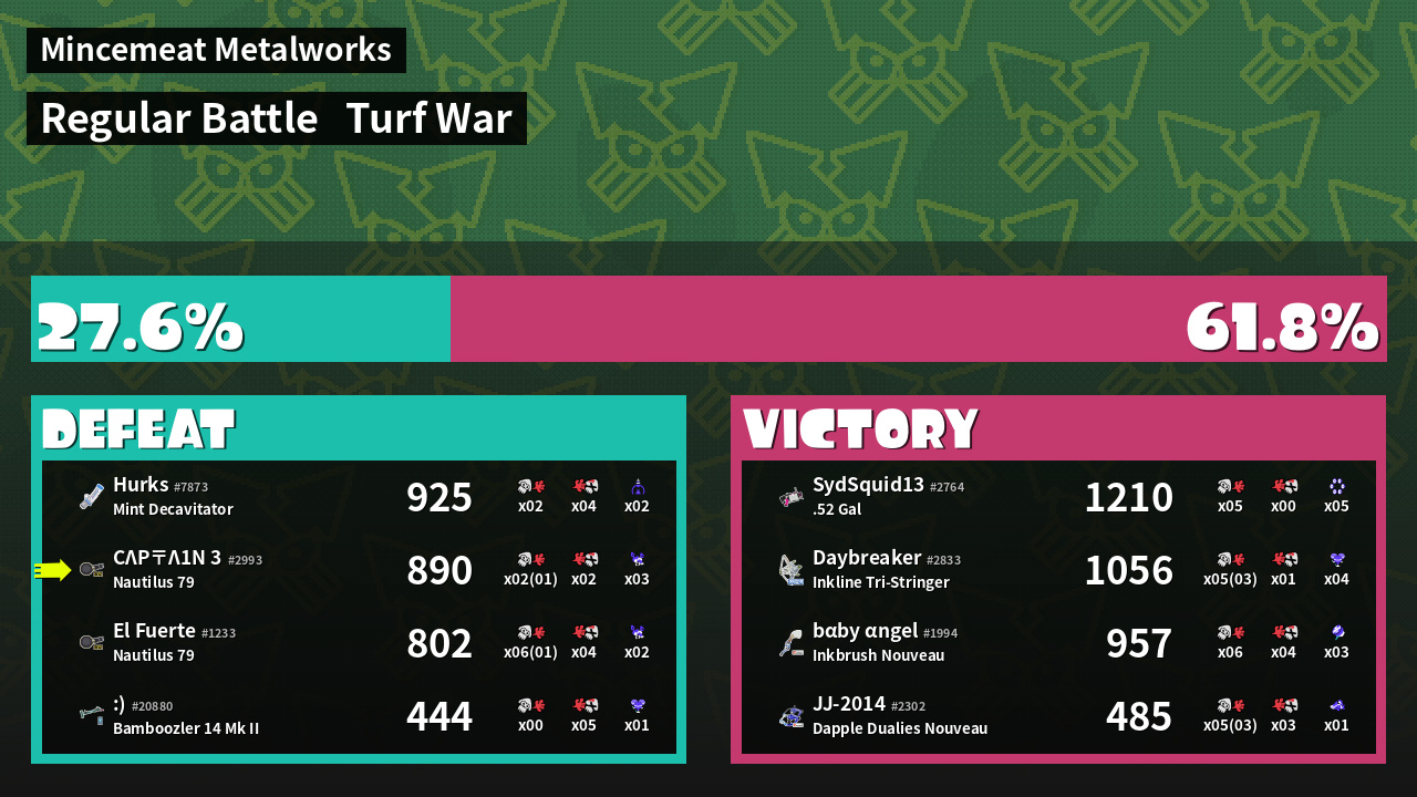 | Medals | #1 Enemy-Base Inker #1 Splat Assister #2 Overall Splatter | ||