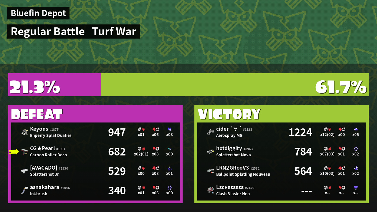 | Medals | #1 Overall Splatter #1 Popular Target #1 Home-Base Inker | ||