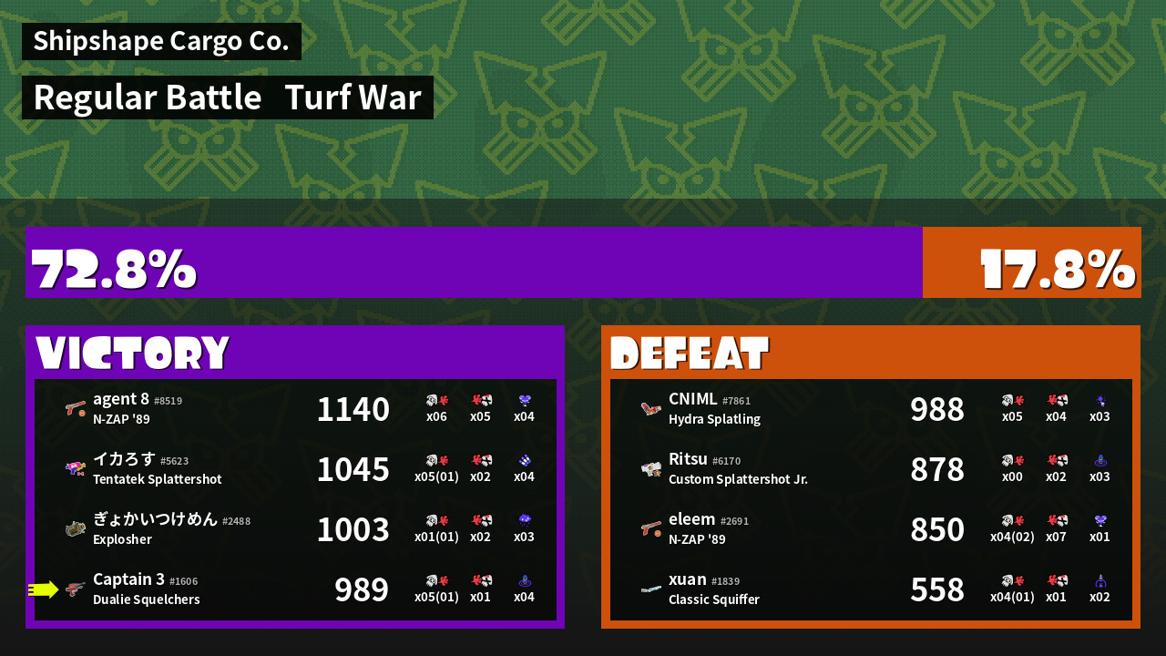 | Medals | #1 Splat Assister #1 Damage Taker #1 Ink Consumer | ||