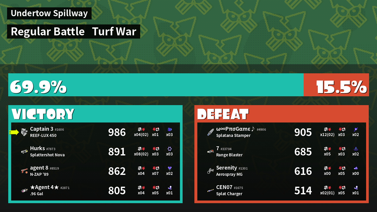 | Medals | #1 Turf Inker #1 Splat Assister #1 Ink Consumer | ||
