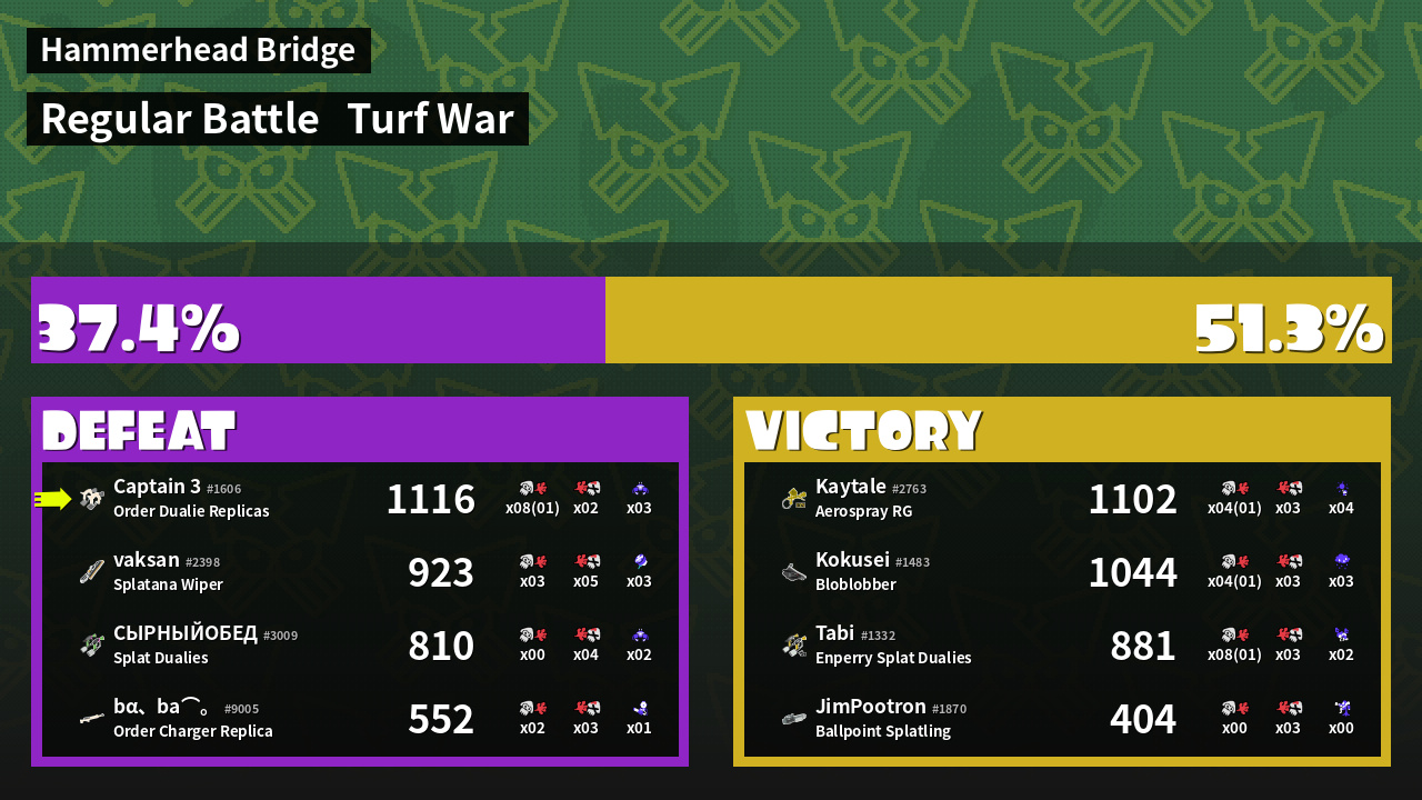 | Medals | #1 Overall Splatter #1 Turf Inker #1 Enemy Splatter | ||