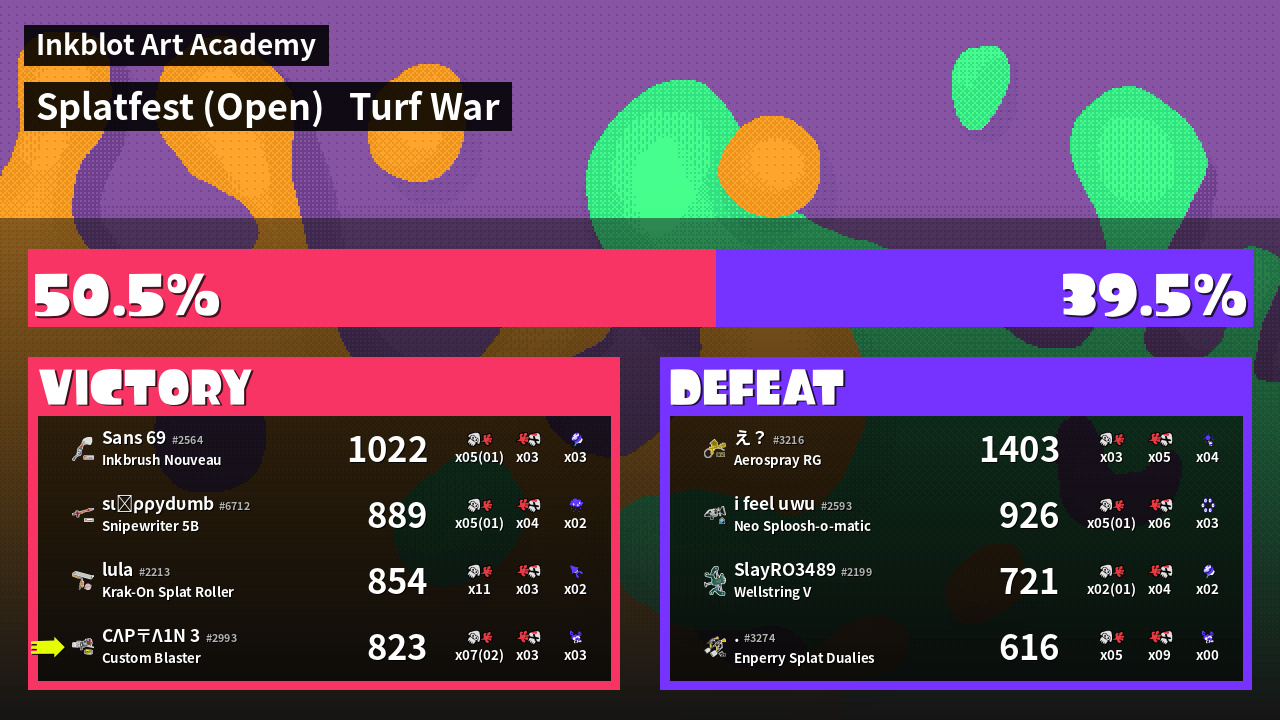 | Medals | #1 Splat Assister #1 Ink Consumer #1 Triple Splashdown User | ||