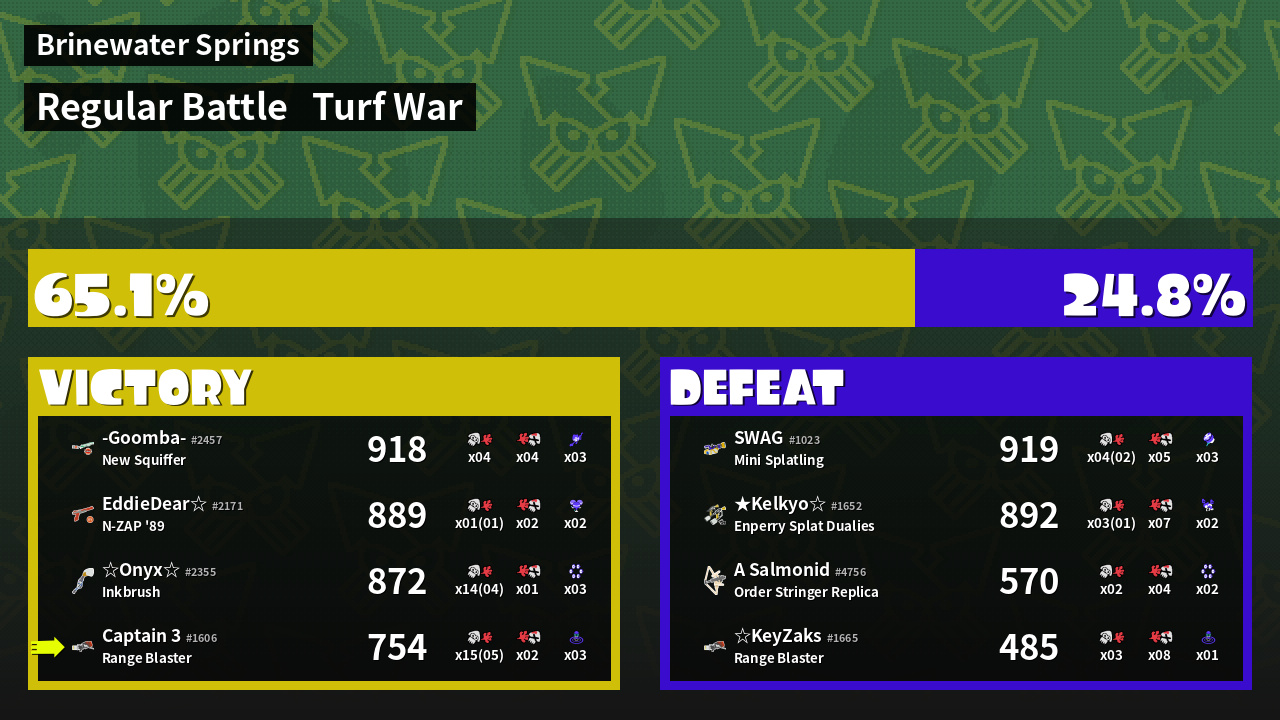 | Medals | #1 Overall Splatter #1 Popular Target #1 Enemy Splatter | ||