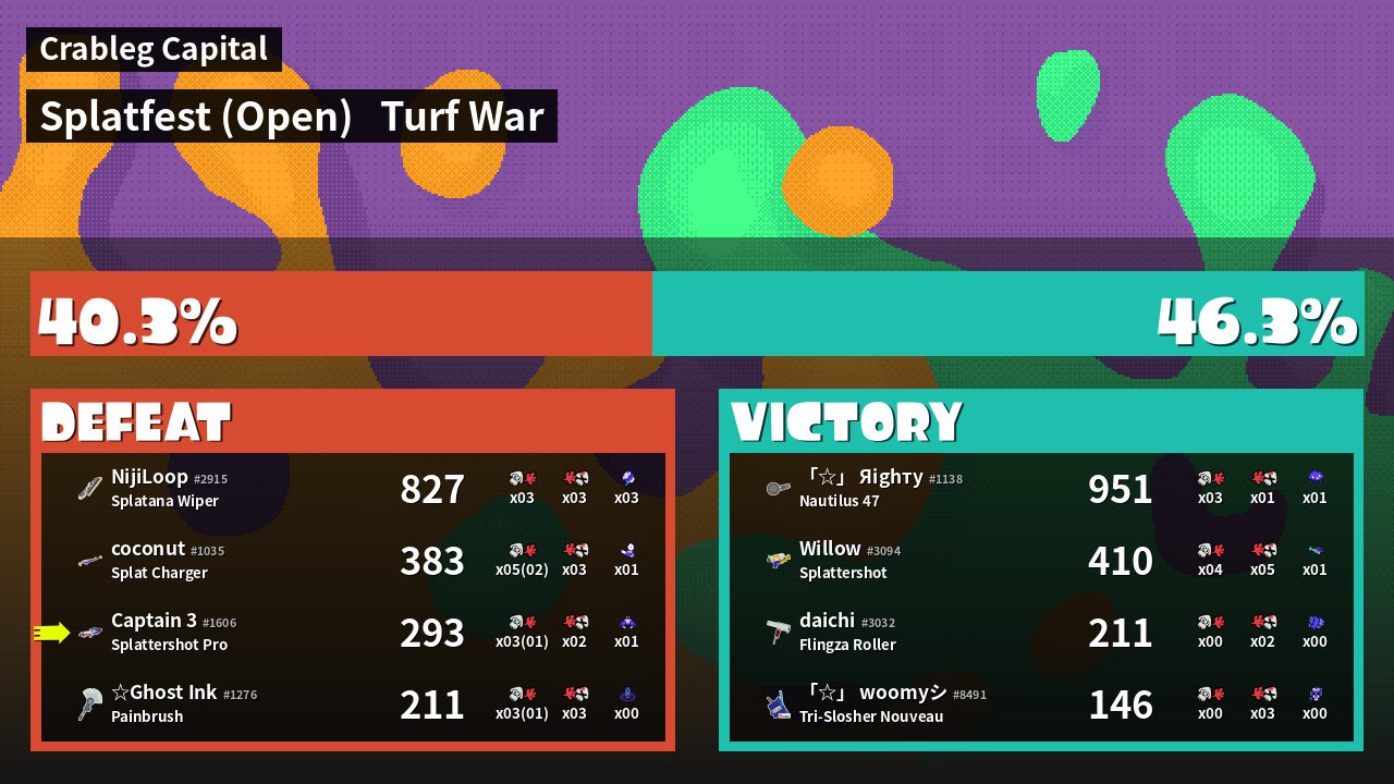 | Medals | #1 Super Jump Spot #1 Crab Tank User #2 Overall Splatter | ||
