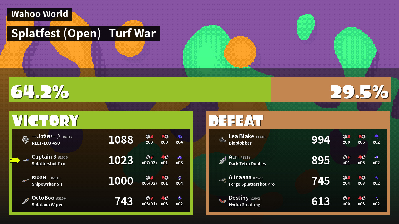 | Medals | #1 Enemy-Base Inker #1 Splat Assister #1 Crab Tank User | ||