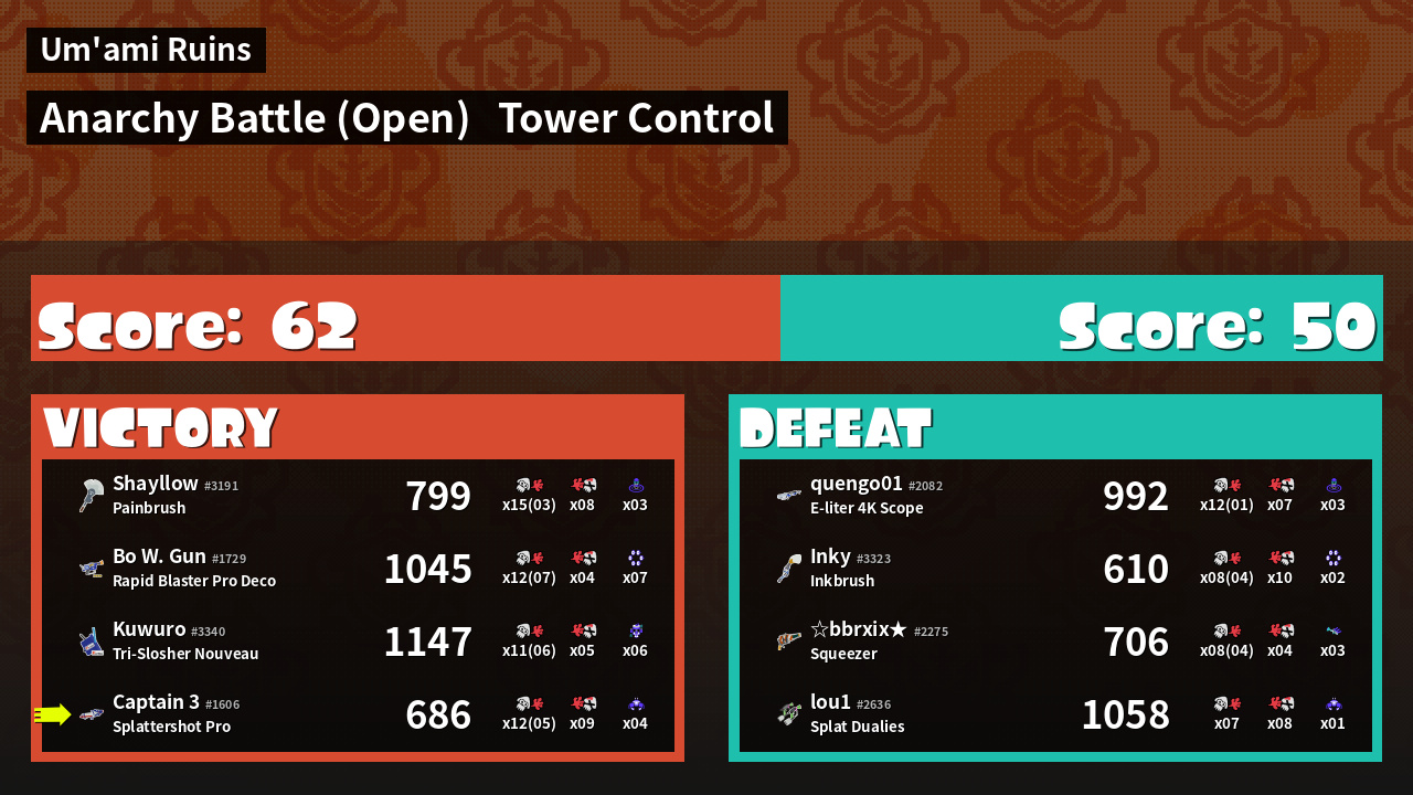 | Medals | #1 Checkpoint Breaker #1 Crab Tank User #2 Overall Splatter | ||
