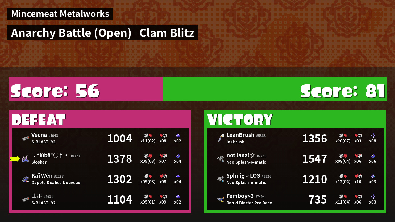 | Mode | Clam Blitz - Anarchy Battle (Open) | ||