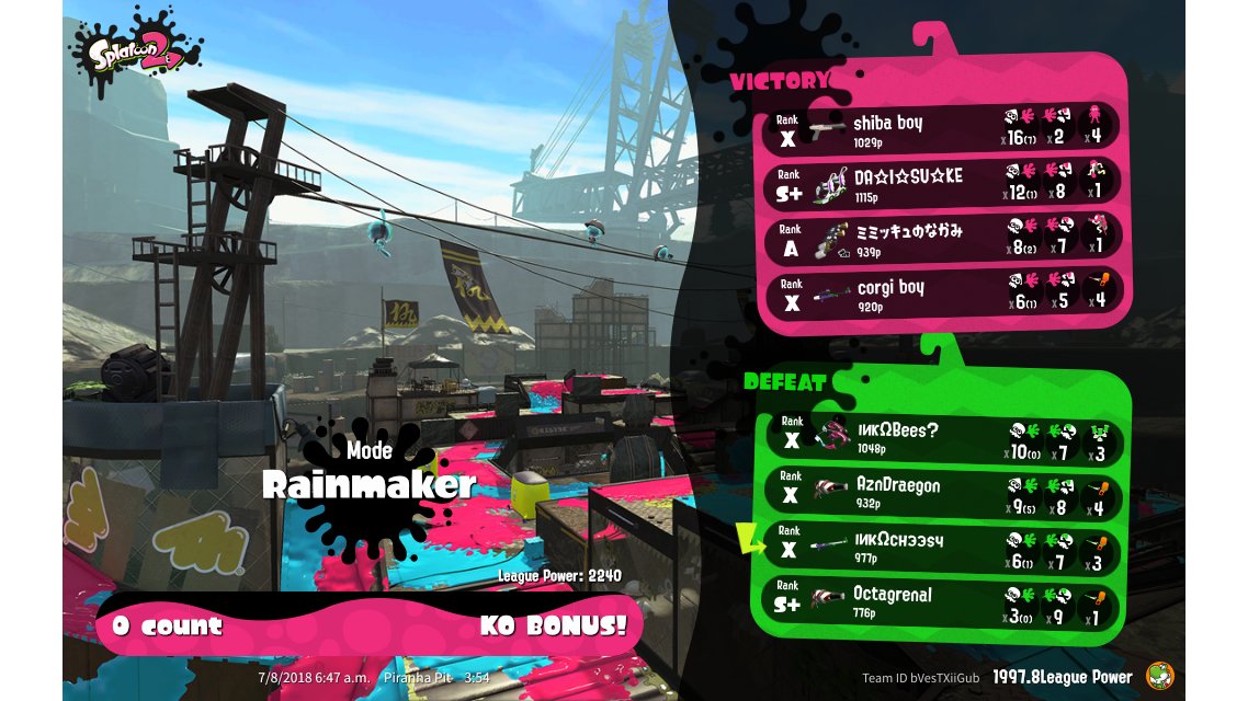 | Mode | Rainmaker - League Battle (Twin) | |||||||||||||||||||||||||||||||