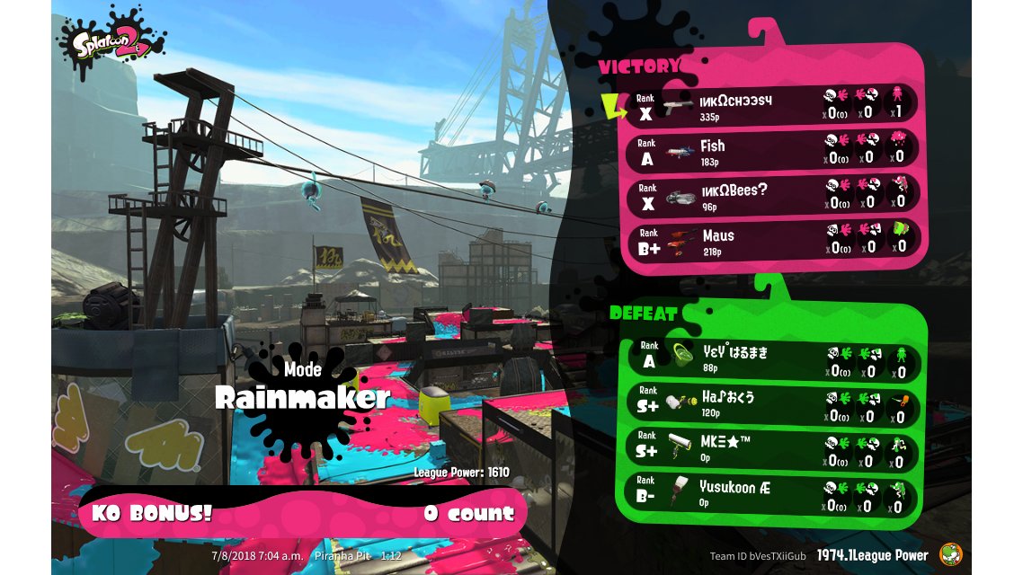 | Mode | Rainmaker - League Battle (Twin) | |||||||||||||||||||||||||||||||