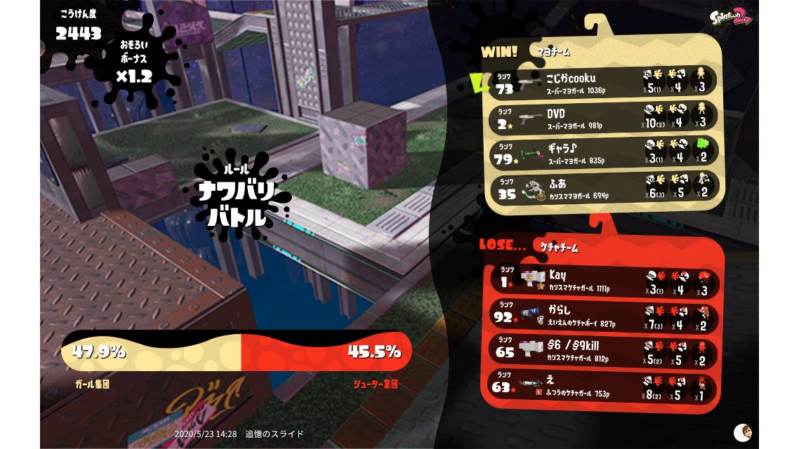| Splatfest Title | マヨ Defender 315 → マヨ Defender 423 | |||||||||||||||||||||||||||||||||||||