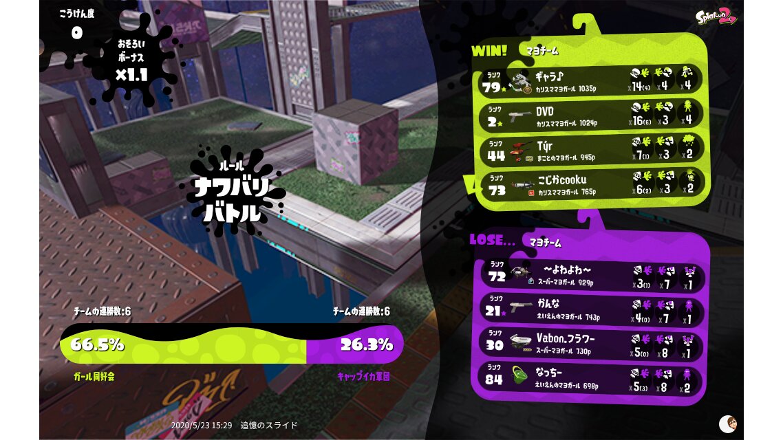 | Team マヨ キャップイカ軍団 Win Streak: 6 | 3,100 | 13 / 30 | 0.43 30.23% | ||||