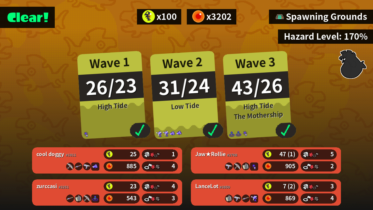 | Weapons | Splat Brella Splat Charger Big Swig Roller | Big Swig Roller Splat Brella Sloshing Machine | Splat Charger Sloshing Machine Splat Brella | Sloshing Machine Big Swig Roller Splat Charger |