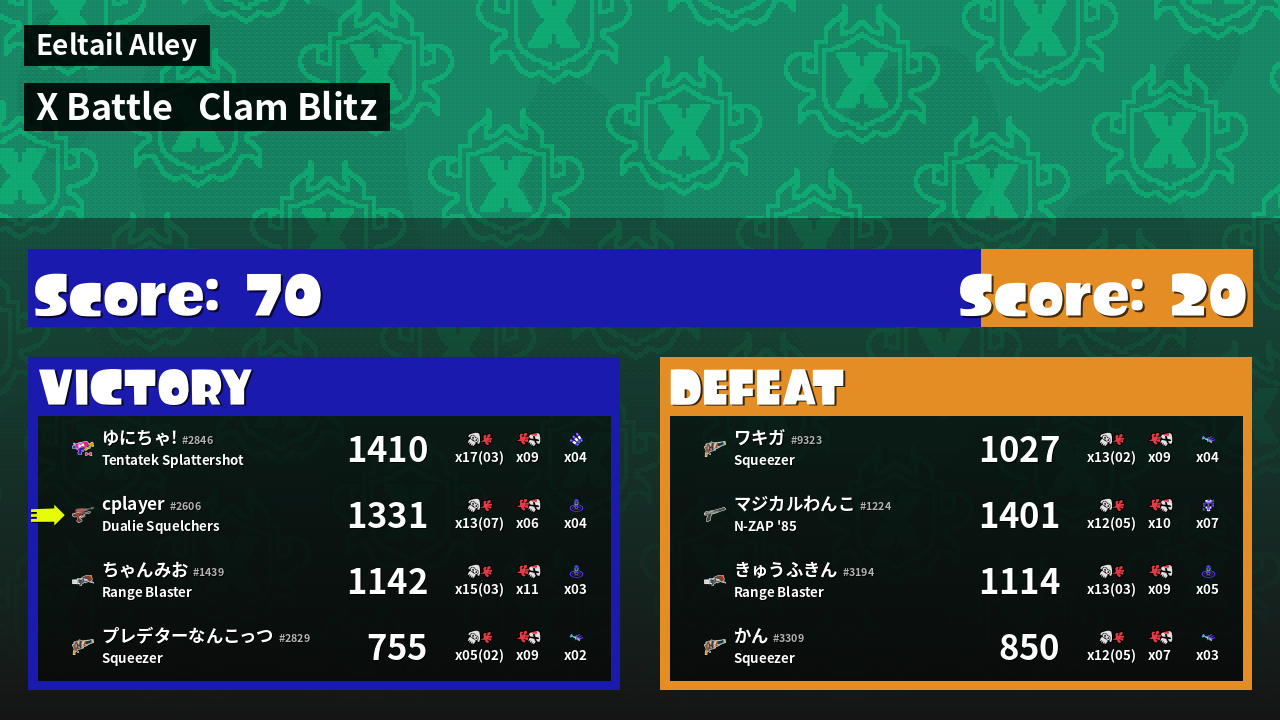 | Medals | #1 Score Booster #1 Splat Assister #1 Clam Stopper | ||