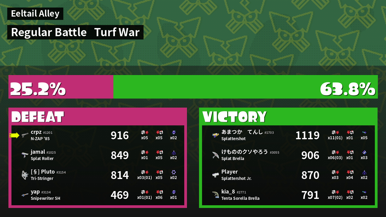 | Medals | #1 Overall Splatter #1 Turf Inker #1 Enemy Splatter | ||