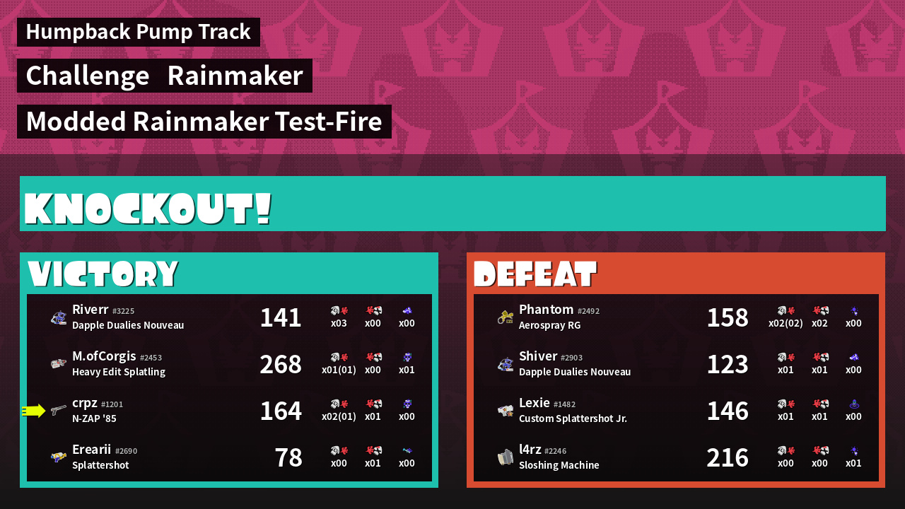 | Medals | #1 Splat Assister #1 Ink Consumer #2 Overall Splatter | ||
