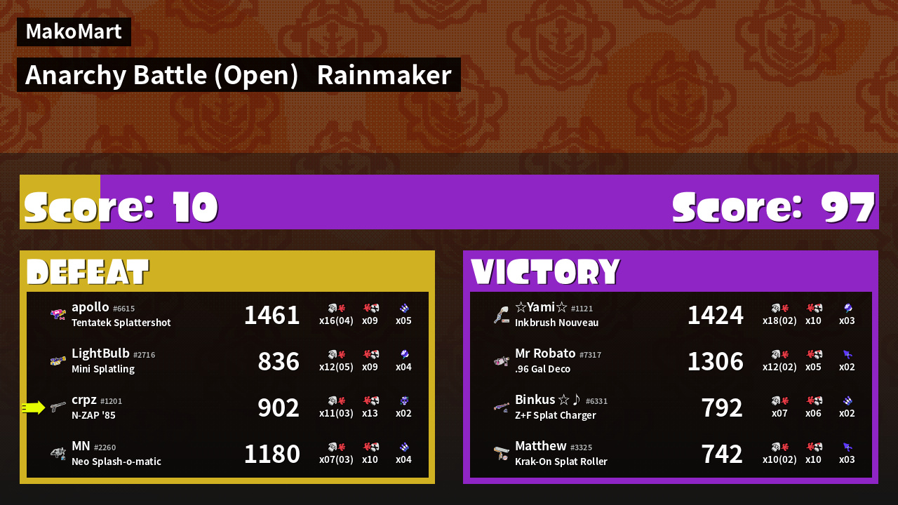 | Mode | Rainmaker - Anarchy Battle (Open) | ||
