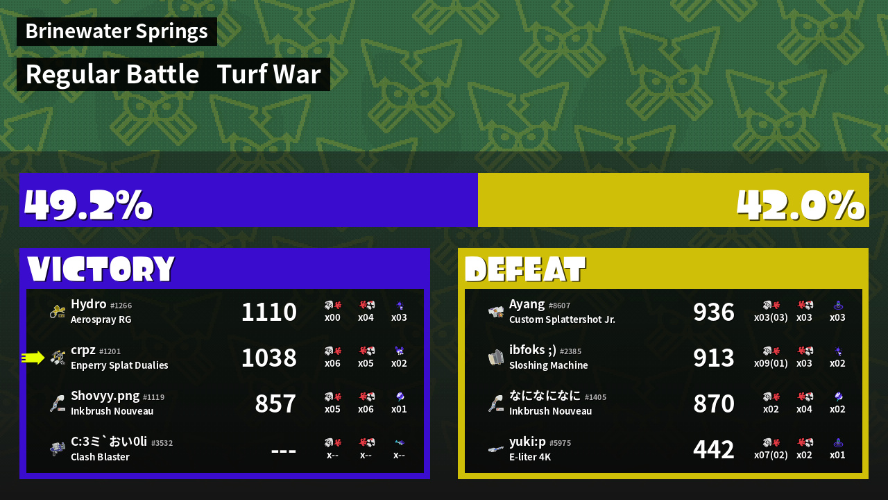| Weapon | Enperry Splat Dualies ( Curling Bomb / Triple Splashdown) | ||