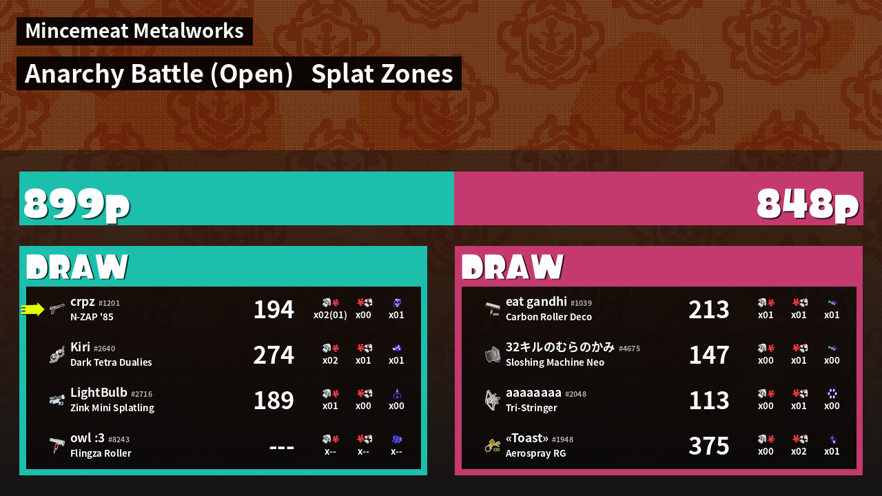 | Mode | Splat Zones - Anarchy Battle (Open) | ||