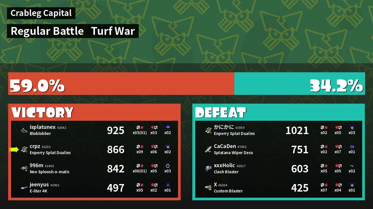 | Weapon | Enperry Splat Dualies ( Curling Bomb / Triple Splashdown) | ||