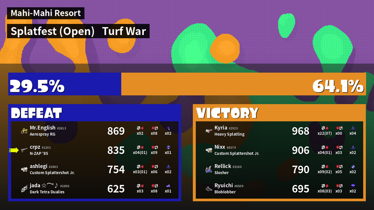 | Medals | #1 Overall Splatter #1 Enemy Splatter #1 Splat Assister | ||