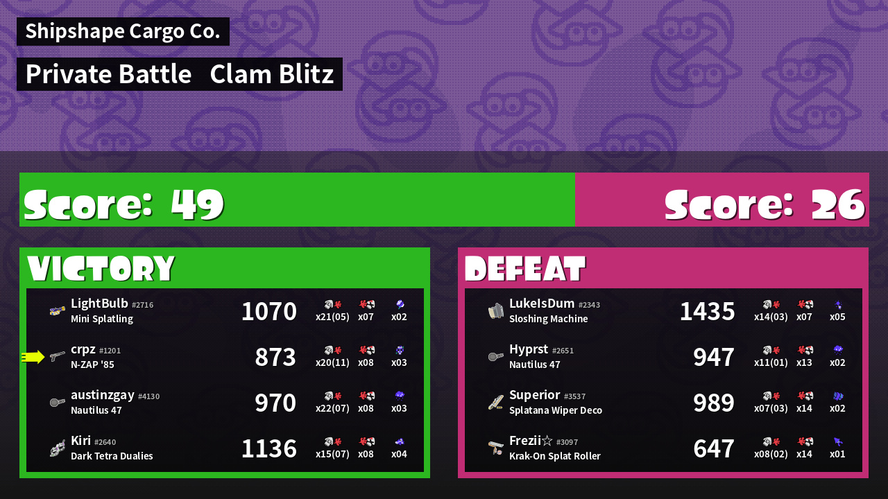 | Mode | Clam Blitz - Private Battle | ||