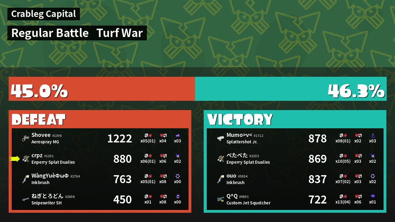 | Weapon | Enperry Splat Dualies ( Curling Bomb / Triple Splashdown) | ||