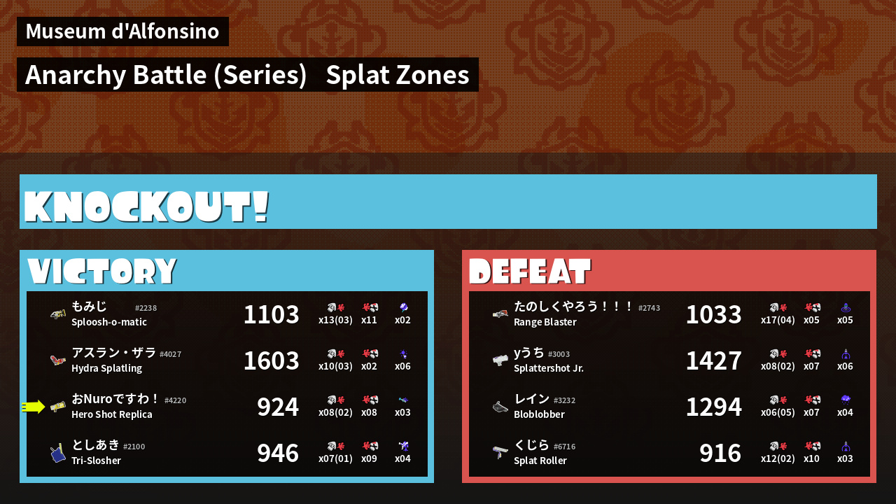 | Medals | #1 Splat Zone Hero #1 Ink Consumer First Splat! | ||